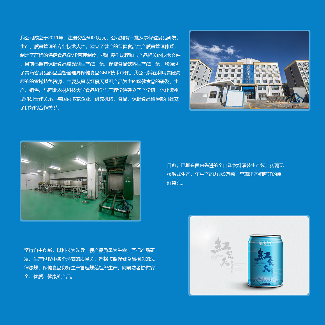青海鑫池源生物科技開發(fā)有限公司2011年3月29日在青海生物科技產業(yè)園區(qū)工商行政管理分局登記成立,注冊資金5000萬元。         鑫池源公司立足于青海省綠色環(huán)保無污染的高品質紅景天資源,以西北農林科技大學食品科學與工程學院和青海格拉丹東藥業(yè)有限公司為技術依托,主要從事紅景天、紅枸杞、黑枸杞等高原生態(tài)植物資源的研究開發(fā)和深加工,產品包括“景胨”牌紅景天西洋參保健飲品、紅景天口服液、紅景天膠囊等系列產品。         公司擁有一批從事保健食品研發(fā)、生產、質量管理的專業(yè)技術人才,建立了健全的保健食品生產質量管理體系,制定了嚴格的保健食品GMP管理制度、標準操作規(guī)程和與產品相關的技術文件,目前已擁有保健食品膠囊劑生...
